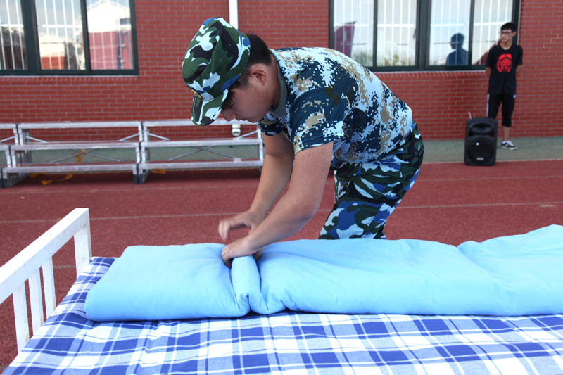 绿茵场上一张张床铺整齐的排列,床铺上面摆放着各参赛选手的被子,各个参赛选手站在各自的被子前做好准备。在军训教官的督导下,只见平时粗心的大男生个个像换了一副面孔,小心翼翼地抹平每一个被角,每一寸褶皱,轻轻地折叠、压平,追求每一个细节的完美,最终呈现在眼前的是豆腐块的效果。
