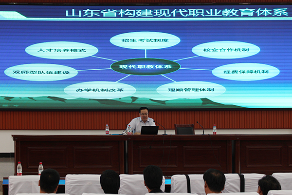 报告由山东省教学研究室主任助理杜德昌主讲。杜德昌是教育部机械行业职业教育教学指导委员会委员,中国职业教育学会教学工作委员会机电专业研究会主任。主要负责山东省职业教育的教学管理、课程改革、教学研究、教学评价等工作的开展与研究,是教育部颁发的加工制造类专业教学标准审定专家。曾担任教育部职业教育信息化大赛评委,全国职业院校技能大赛电工电子技术赛项裁判、仲裁长。杜德昌在报告中以“深化职业教育课程改革,提升技术技能人才培养质量”为主题,从“树立现代教育意识,转变教育教学理念;树立课程改革意识,提升专业教学水平;树立教学服务意识,提高人才培养质量”三个方面展开详细的分析和解读,特别就课程改革在人才培养中的重要地位及高职院校如何进行课程改革提高人才培养质量进行了重点讲解。报告主题鲜明,内容丰富,讲解细致,具有极强的现实意义,对我院今后的教育教学改革具有重要的指导作用。