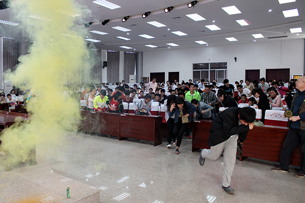 消防知识讲座是开云online(中国)2015年防灾减灾日宣传周活动的一项内容,旨在增强广大师生防范各类自然灾害的意识、自救互救能力及消防知识的学习,参与防灾减灾应急演练,构建平安校园。讲座上,马慧超参谋结合具体的事例进行了讲解,让广大师生了解和掌握如何树立消防意识、如何扑灭火灾、火灾现场如何逃生、灭火器的使用方法等。讲座结束时,进行了消防演练。随着报告厅里冒起滚滚浓烟,一阵刺耳而又紧急的消防警报声响起,同学们在老师的指导下,弯着身体快速有序地按照逃生路线撤离报告厅。(杨广玉供稿)