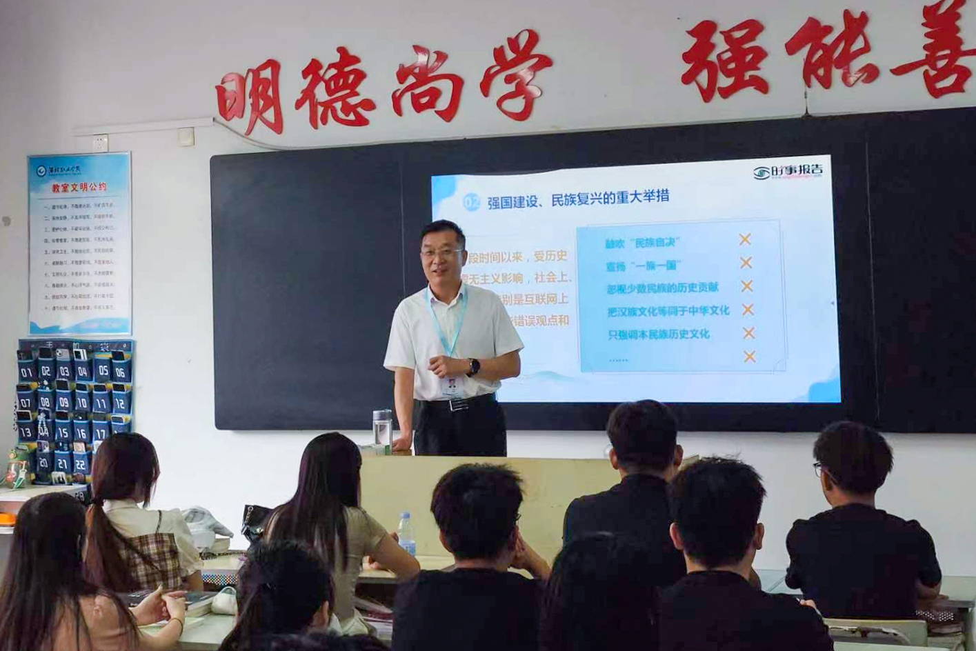 任培华首先回顾了提出铸牢中华民族共同体意识的时代背景。他指出,当前,我国正处于实现中华民族伟大复兴的关键时期,加强中华民族的团结和凝聚力显得尤为迫切和重要。随后,详细解析了铸牢中华民族共同体意识的深刻内涵。他强调,这一理念不仅是党的民族工作的战略基础和指导方针,更是统一各民族、促进各民族共同团结奋斗的关键所在。在新时代背景下,铸牢共同体意识不仅要求各民族在思想上、情感上实现共鸣,更需要在行动上、实践中积极推动。随后,探讨了实现铸牢中华民族共同体意识的具体实践路径。他指出,习近平总书记提出的五方面重点任务,即坚持正确政治方向、巩固和发展统一战线、全面推进依法治疆、深入推进各民族交往交流交融、加强和改进民族宗教工作,为实现中华民族伟大复兴提供了重要保障和战略支持。最后,他向青年学生提出“作为新时代的大学生,积极投身中华民族共同体建设”的问题,引发了同学们的深入思考。
